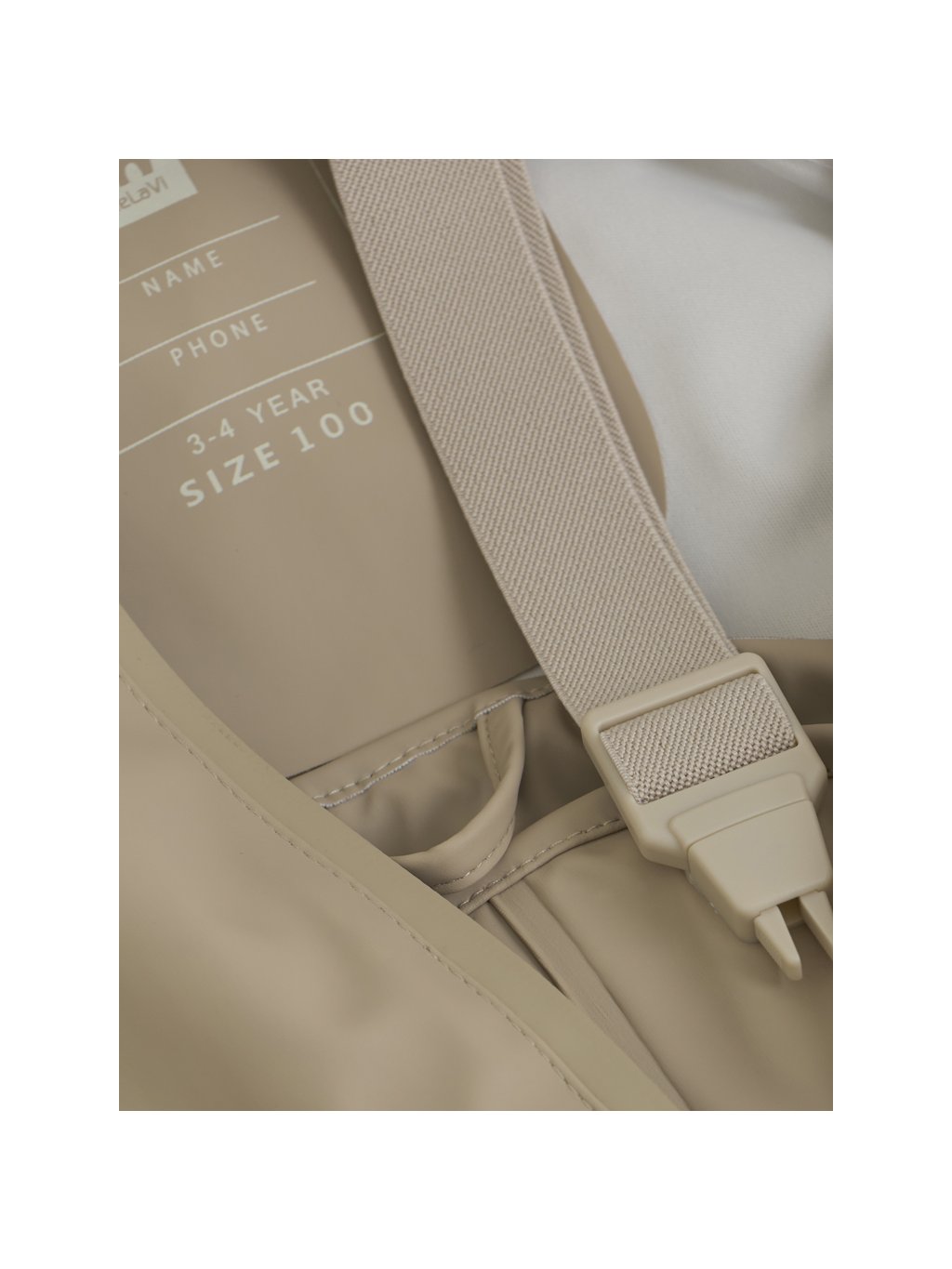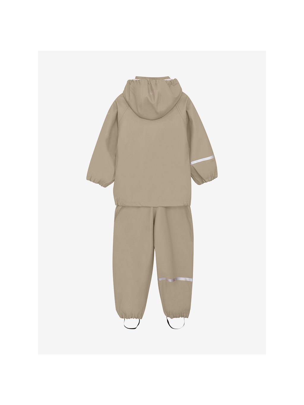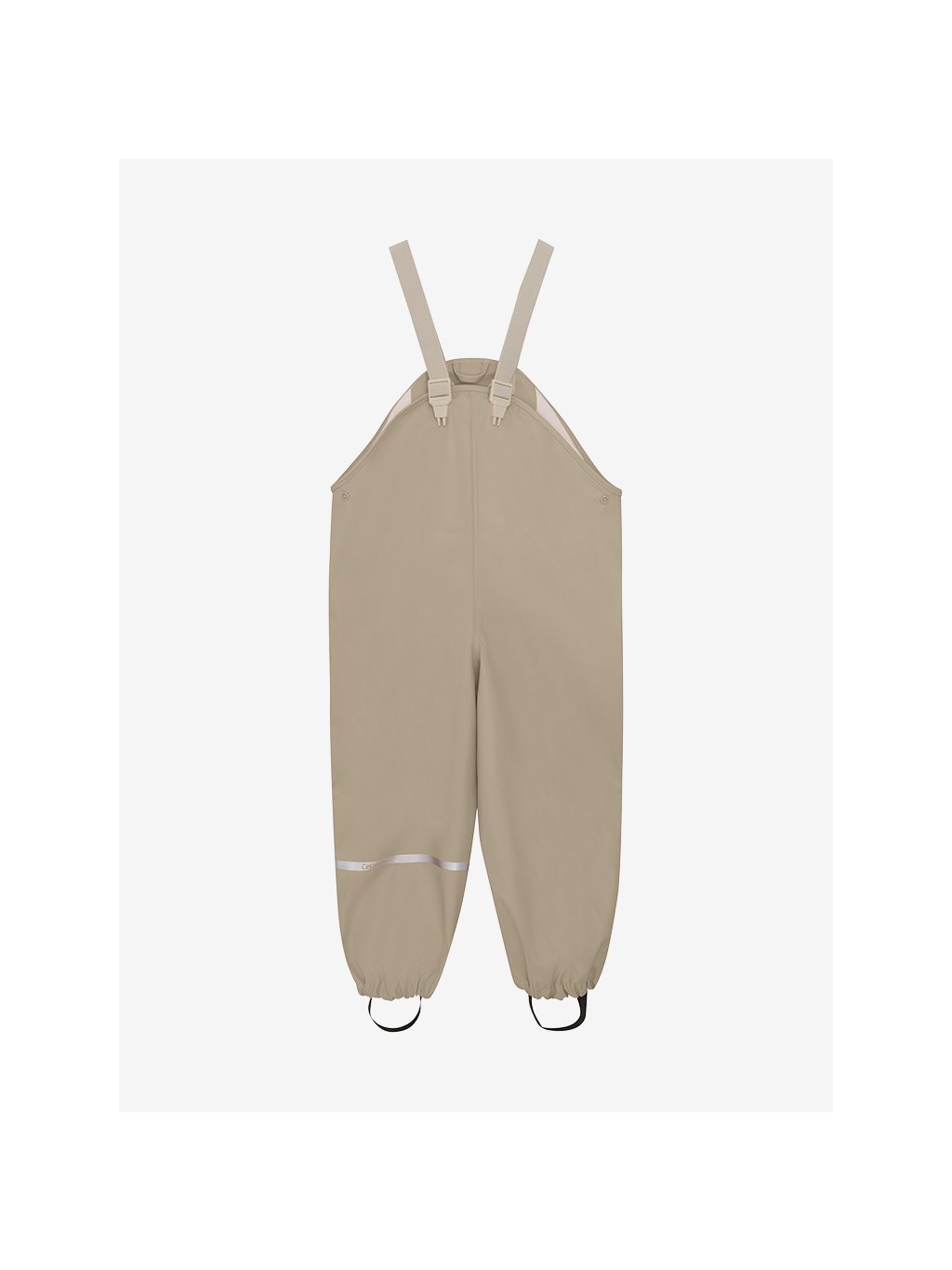 Kalhoty do deště ve velikostech 70–100 mají nastavitelné elastické kšandy a druky na bocích pro snadné oblékání. Všechny velikosti jsou vybaveny nastavitelnými elastickými pásky pod chodidla, které drží nohavice na místě přes holínky i při skákání v kalužích.