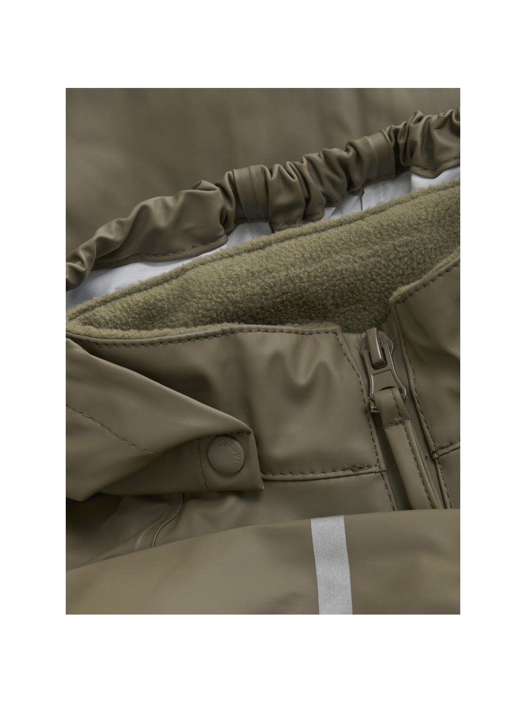 Pláštěnková bunda je vybavena voděodolným zipem a odnímatelnou kapucí. Elastické lemy na rukávech, v kapuci a v pase pomáhají zabránit pronikání vody a větru. Pro lepší viditelnost dítěte za šera nebo ve tmě jsou na oblečení umístěny reflexní prvky – na rukávu, nohavici i kapuci.