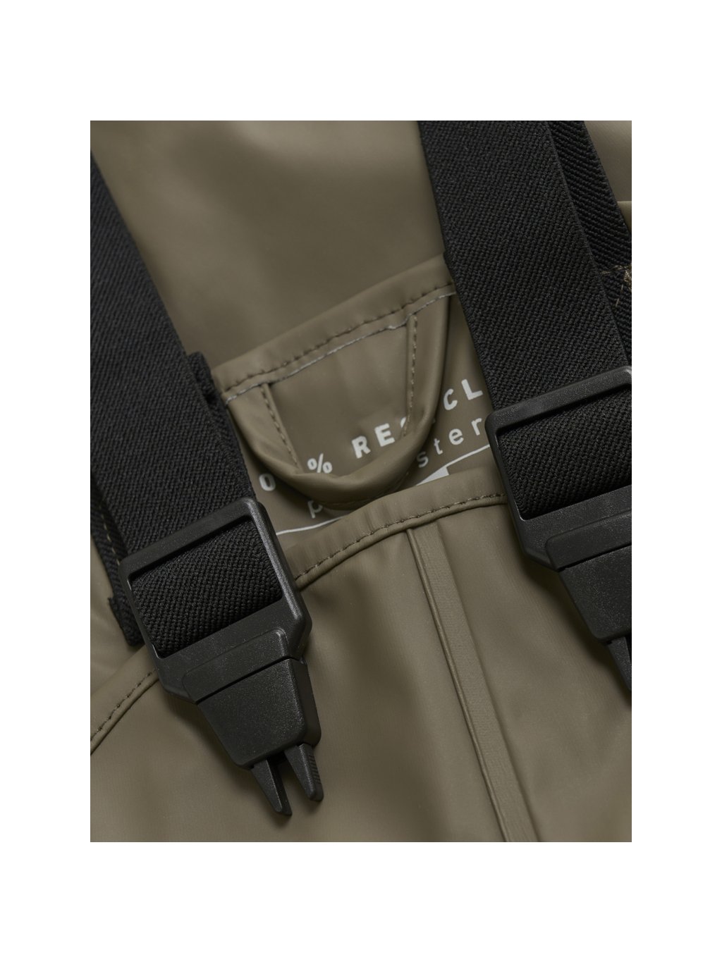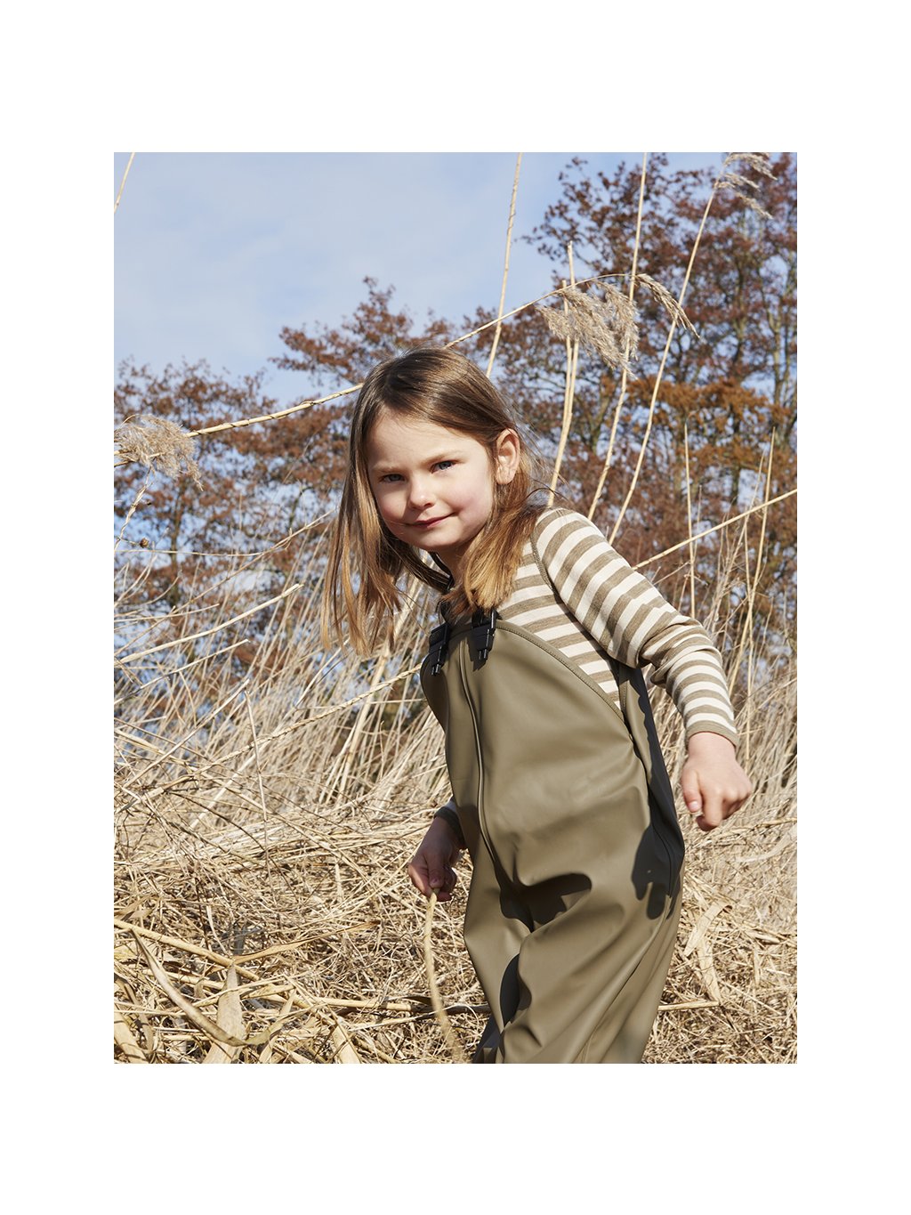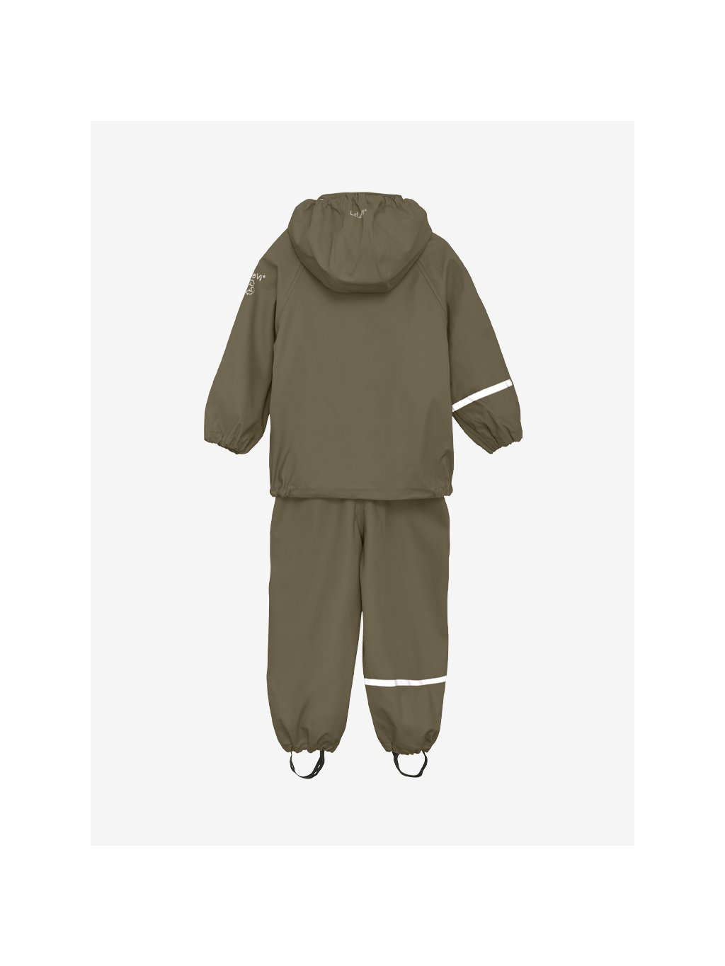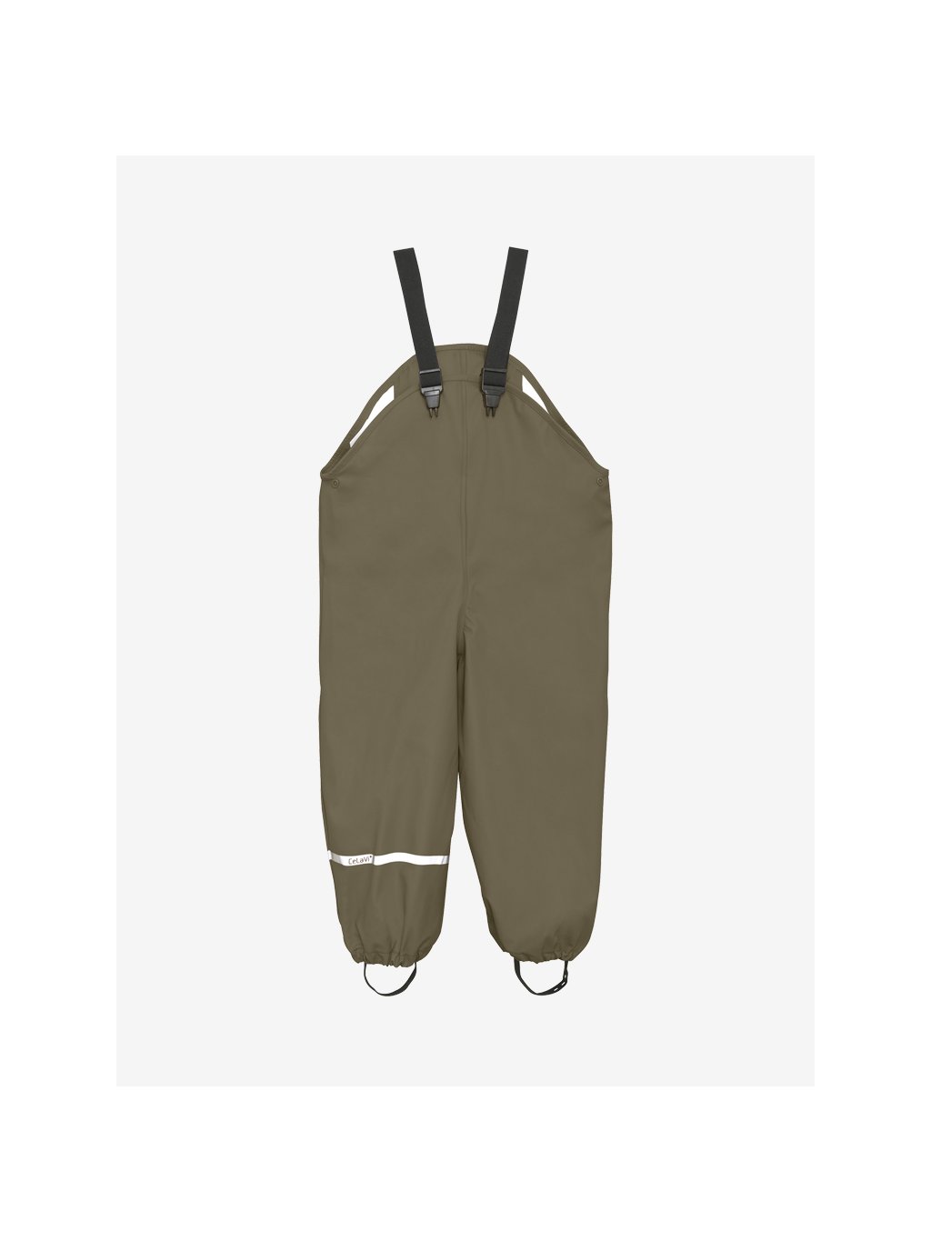 Kalhoty do deště ve velikostech 70–100 mají nastavitelné elastické kšandy a druky na bocích pro snadné oblékání. Všechny velikosti jsou vybaveny nastavitelnými elastickými pásky pod chodidla, které drží nohavice na místě přes holínky i při skákání v kalužích.