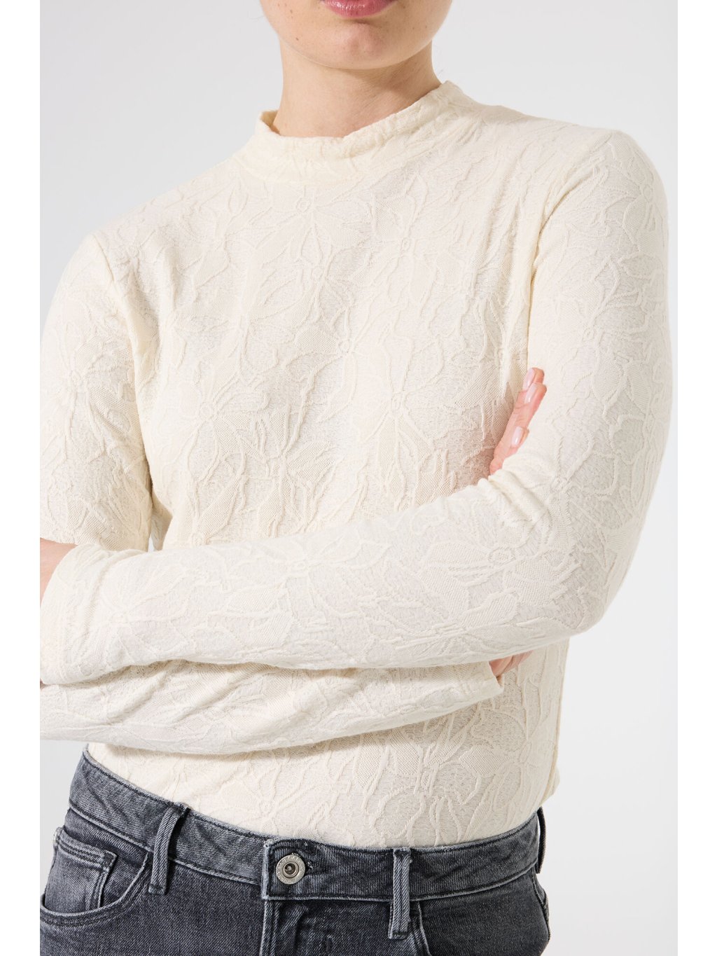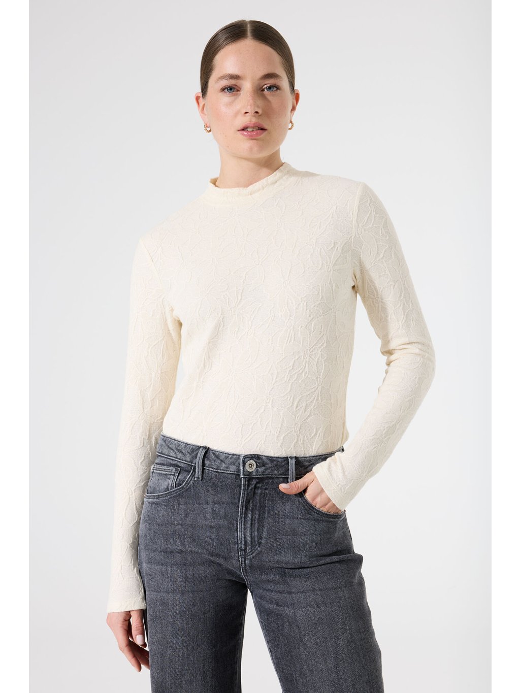 Dámské triko s dlouhým rukávem a žakárovou strukturou je elegantní kousek, který dodá vašemu outfitu výjimečný vzhled. Díky stojáčku, dlouhým rukávům a regular střihu působí moderně, nadčasově a zároveň zajišťuje pohodlné nošení po celý den. Kombinace materiálů 40 % bavlna, 38 % polyester, 17 % viskóza a 5 % polyamid nabízí měkkost, prodyšnost a jemnou pružnost.