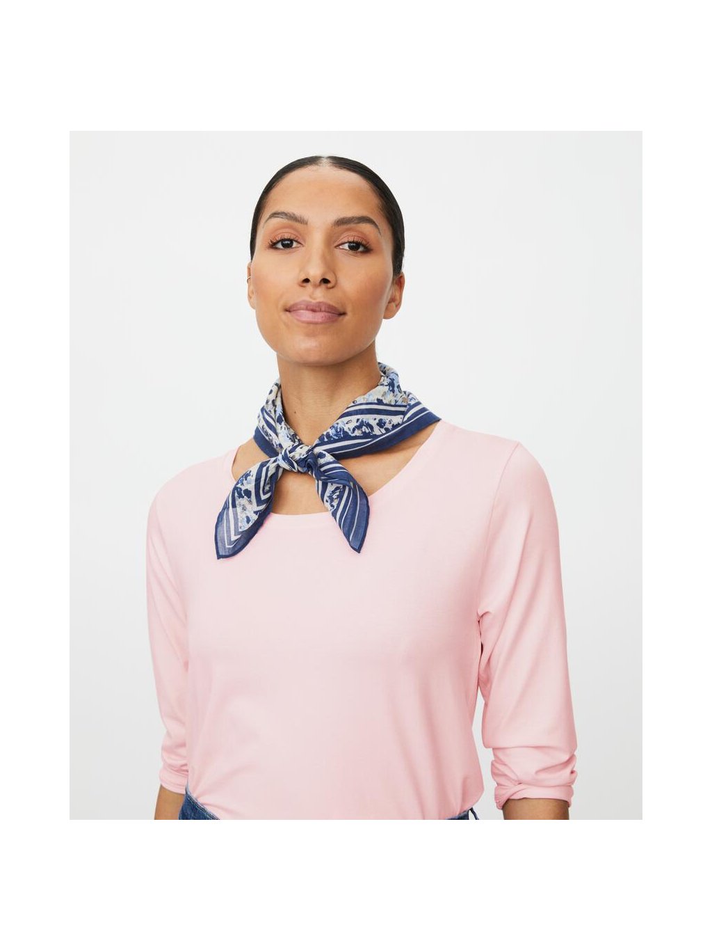 Malý šátek je nejjednodušší způsob, jak outfit rychle oživit. Tento čtvercový šátek z jemné bavlny zdobí ručně malovaný print v krásných odstínech modré, který je orámovaný čistými liniemi pro elegantní, grafický efekt. Uvažte si ho kolem krku na jednoduchý uzel a během chvilky dodáte outfitu svěží a ženský detail.