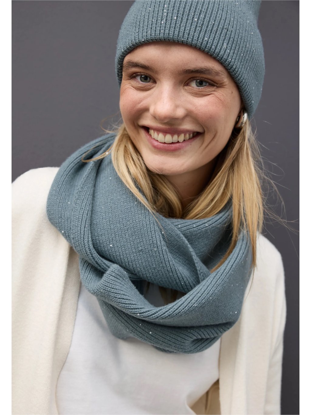 Stylový šál typu loop od značky Street One nadchne měkkou žebrovanou strukturou a lesklými flitry, které vytvářejí třpytivé akcenty. Příjemný materiál se hebce oviní kolem krku a zajistí hřejivý komfort. Elegantní doplněk, který vašemu outfitu dodá jedinečný šmrnc.