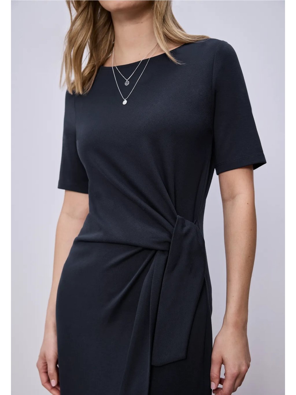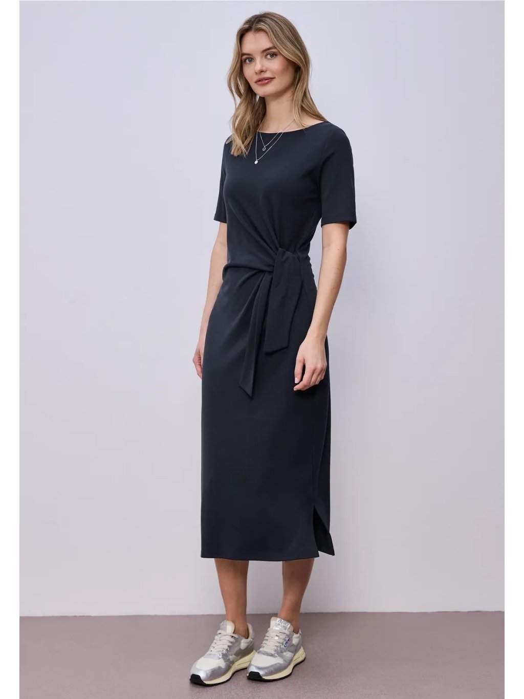 Dámské jerseykleid Street One je pohodlné midi šaty s měkce splývavou siluetou, které využijete na každý den i na upravenější příležitosti. Kulatý výstřih a krátké rukávy působí čistě a nadčasově, zatímco zavazování v pase vytváří ženské zvýraznění postavy a dodává modelu moderní detail. Příjemný jersey materiál se pohodlně nosí a krásně drží tvar. Skvělé k teniskám pro casual look i k balerínám či sandálům pro elegantnější styling.