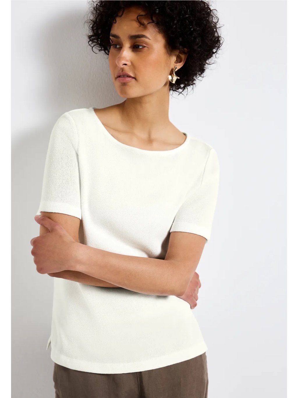 Dámské letní tričko Street One zaujme příjemně měkkým materiálovým mixem a trendy pleteným vzhledem. Výstřih do lodičky a krátké rukávy dodávají modelu jemně ženský charakter, zatímco boční rozparky zajistí ležérní siluetu a pohodlné nošení.