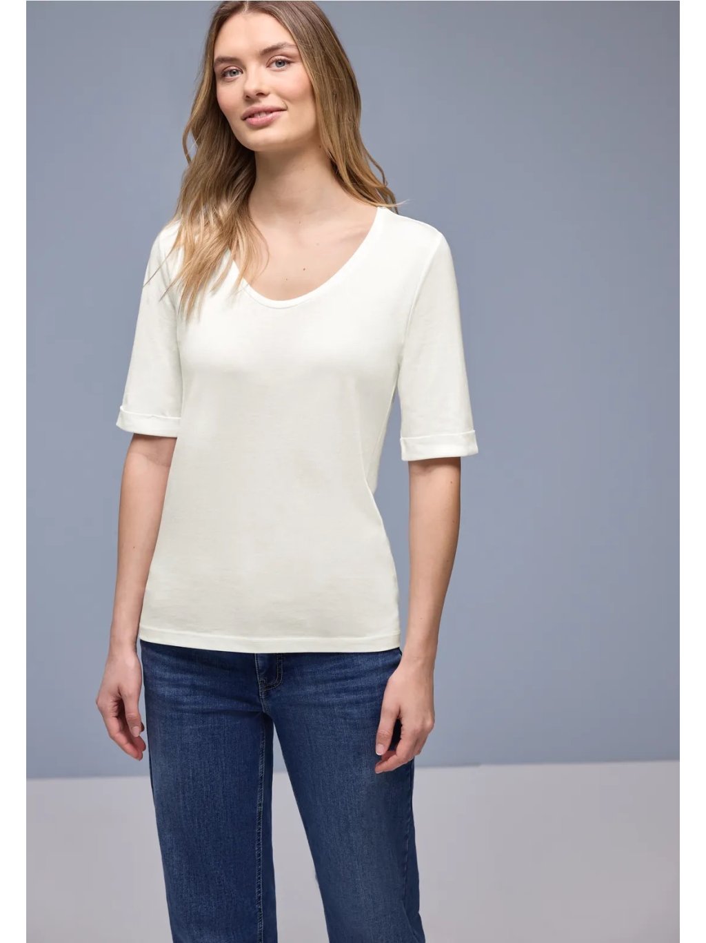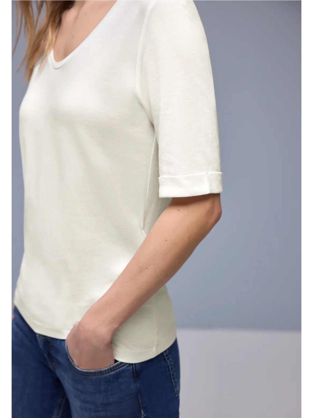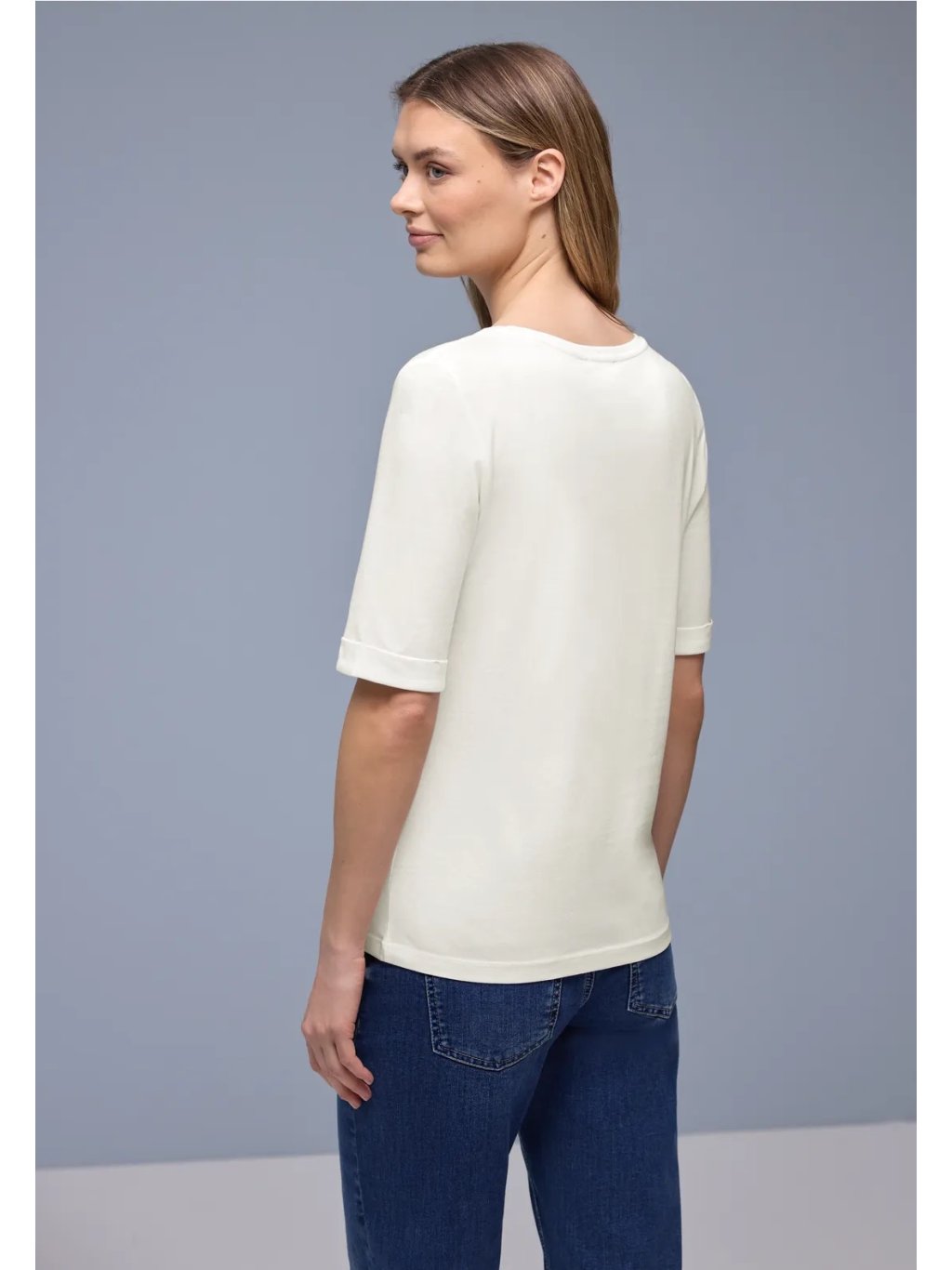 Dámské tričko Street One zaujme ležérními ohrnutými rukávy (Turn-Up detail) a ženským výstřihem do „V“. Měkký materiál z bavlny a modalu je příjemný na dotek a zaručuje celodenní komfort. Díky jednobarevnému provedení se snadno kombinuje s jakýmkoli outfitem – ideální volba pro pohodlné a nenáročné každodenní nošení.