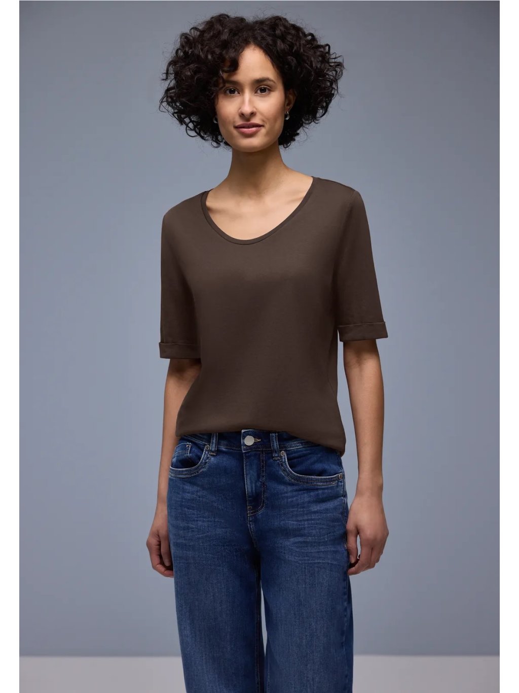 Dámské tričko Street One zaujme ležérními ohrnutými rukávy (Turn-Up detail) a ženským výstřihem do „V“. Měkký materiál z bavlny a modalu je příjemný na dotek a zaručuje celodenní komfort. Díky jednobarevnému provedení se snadno kombinuje s jakýmkoli outfitem – ideální volba pro pohodlné a nenáročné každodenní nošení.