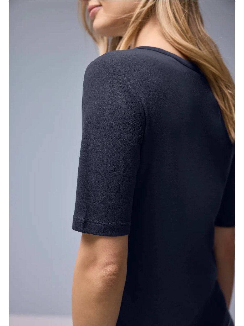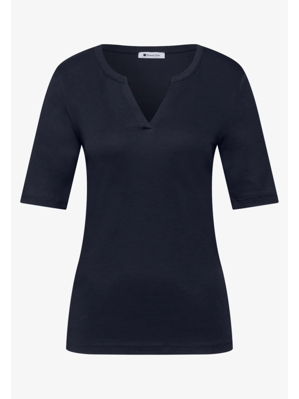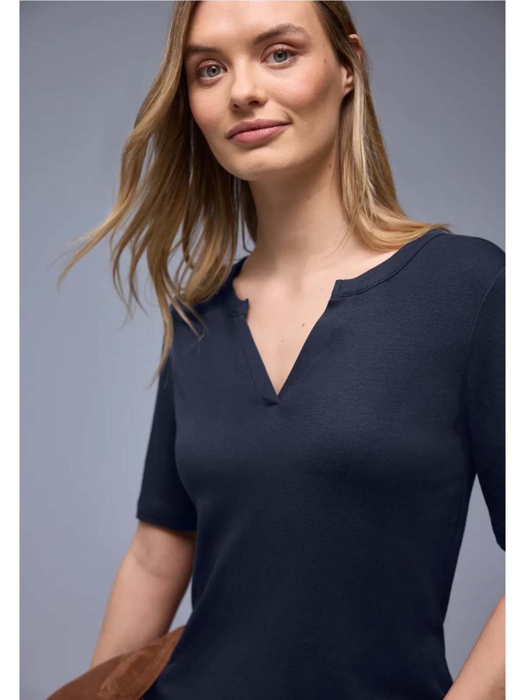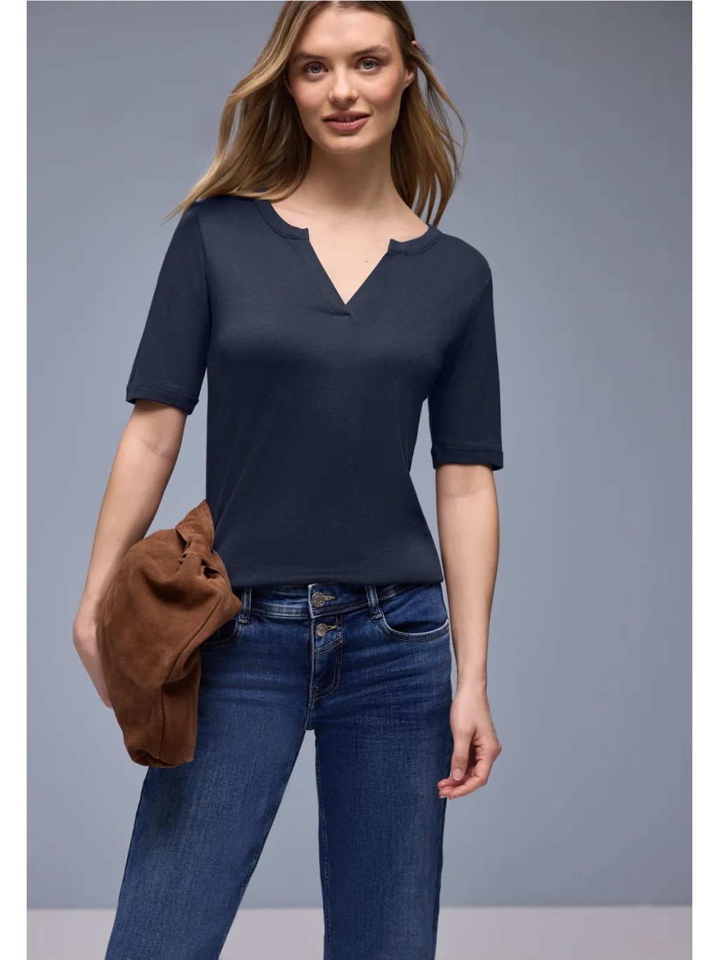 Dámské tričko z žerzeje od značky Street One nadchne ležérním výstřihem do „V“ (Split Neck), krátkými rukávy a příjemně měkkým materiálem z kombinace bavlny a modalu. Díky jednobarevnému provedení je maximálně univerzální a snadno kombinovatelné. Skvěle vypadá samostatně, ale i pod sakem nebo kardiganem – ideální kousek pro každodenní outfit.