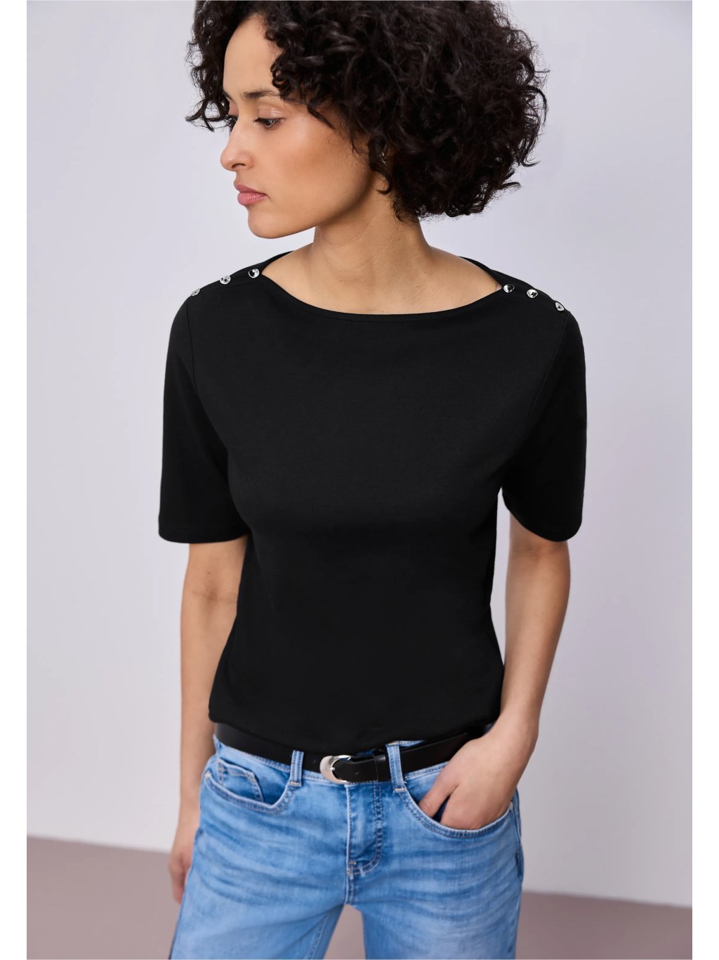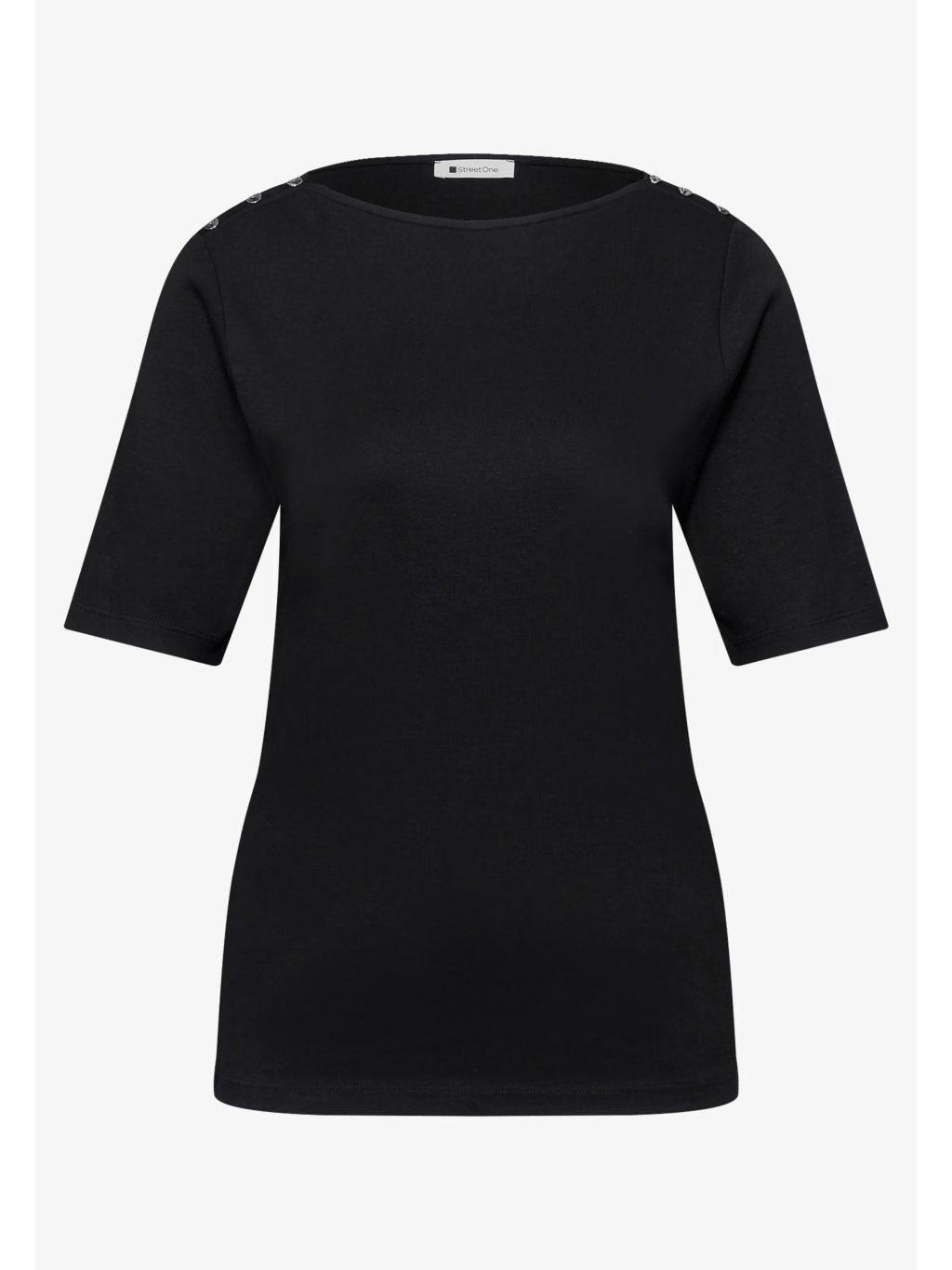 Dámské tričko s krátkým rukávem Street One s ozdobným knoflíkovým detailem je pohodlný a univerzální kousek pro každodenní nošení. Jednoduchý střih doplňuje ženský výstřih a dekorativní knoflíky na ramenou, které dodávají tričku moderní vzhled. Příjemný materiál s podílem bavlny je měkký na dotek a zajišťuje komfort po celý den.