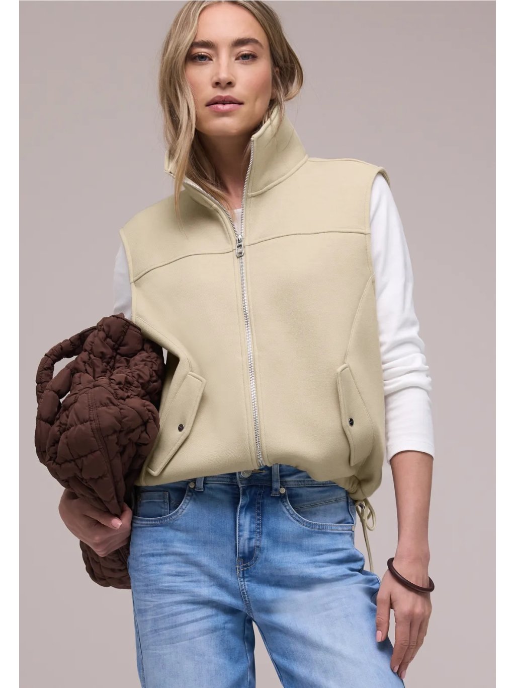 Dámská krátká doubleface vesta Street One zaujme moderním, čistým designem a pohodlným nošením. Límec a zapínání na zip jí dodávají sportovně minimalistický vzhled, zatímco boční kapsy přinášejí praktický detail na každý den. Stahování v lemu umožní upravit siluetu podle potřeby. Skvělý layering kousek pro variabilní casual outfity v přechodném období.
