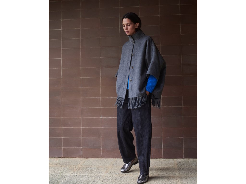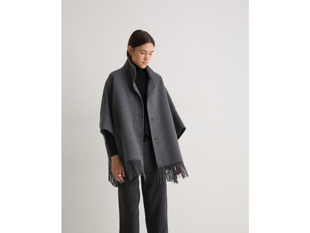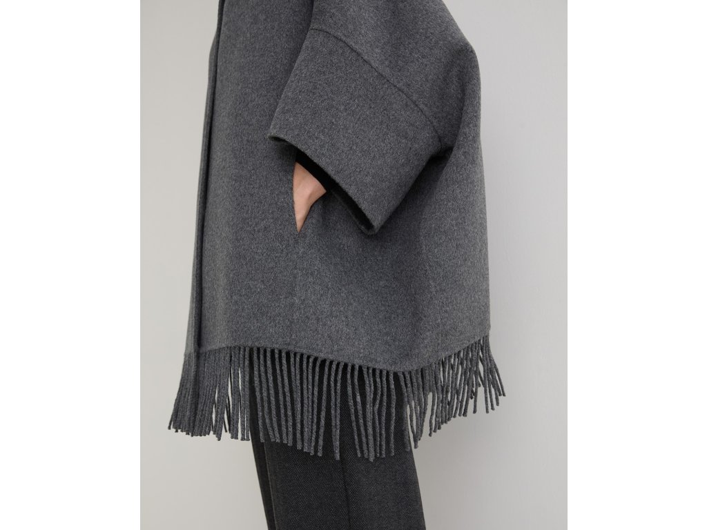 Vyrobený z vlněné směsi s jemnými třásněmi po obvodu nabízí dokonalou kombinaci tepla, lehkosti a přirozené elegance. Ideální jako svrchní vrstva pro chladnější dny – snadno se kombinuje s šaty, svetrem nebo kabátem.