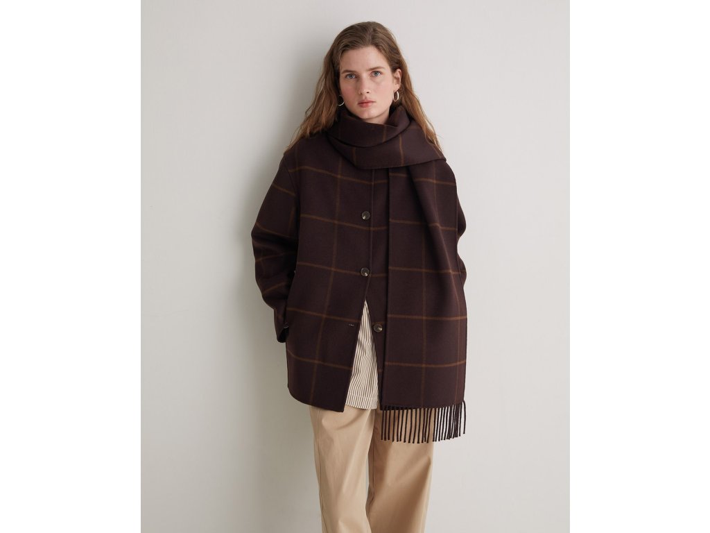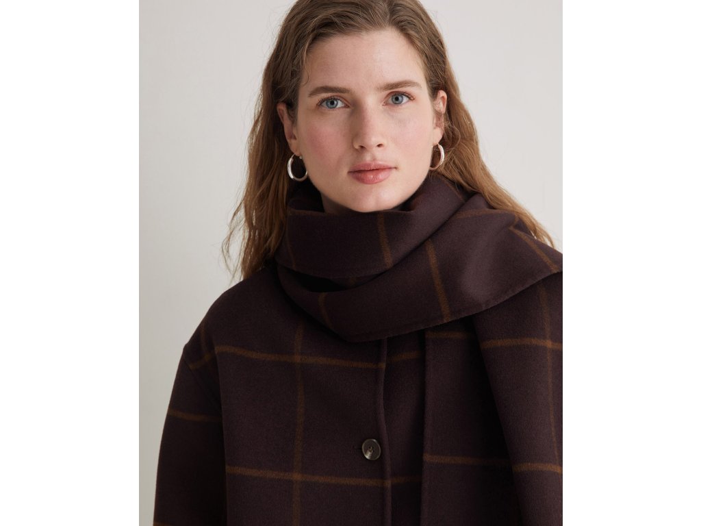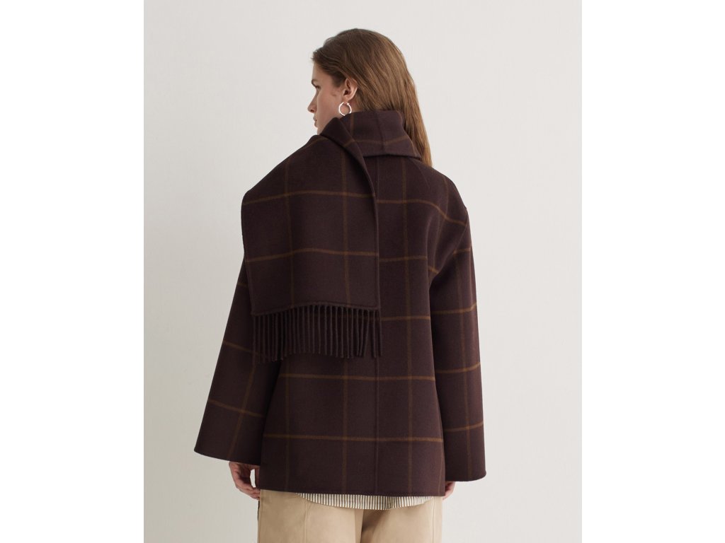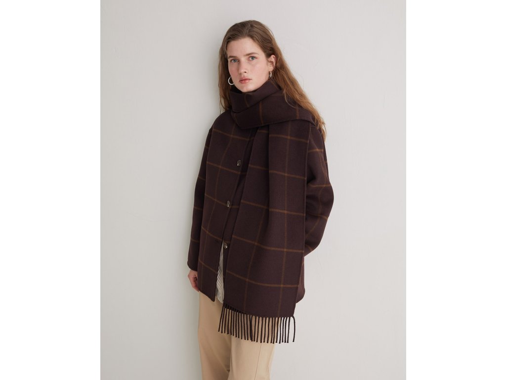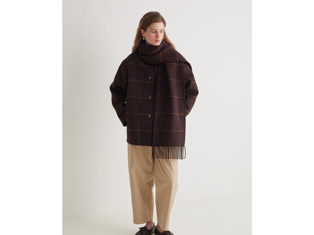 Elegantní kabát v hřejivém hnědém tónu spojuje nadčasový design s praktickým detailem – součástí je integrovaný šál, který nelze oddělit. Kabát je vytvořen v precizním zpracování ruční výroby, s důrazem na kvalitu a styl.