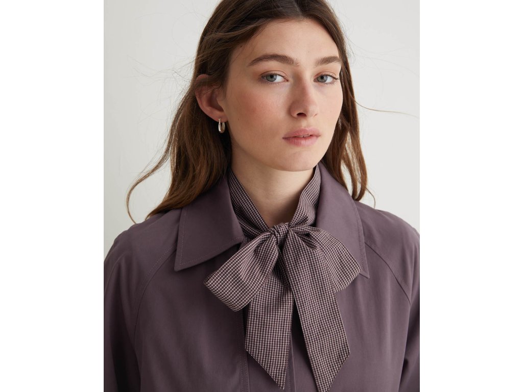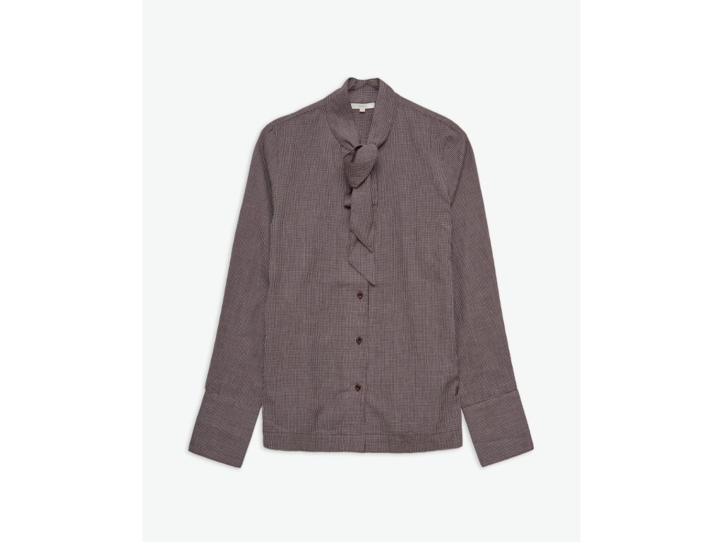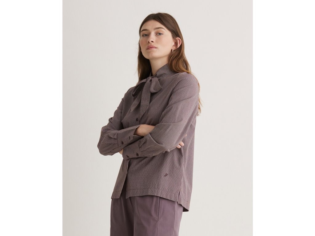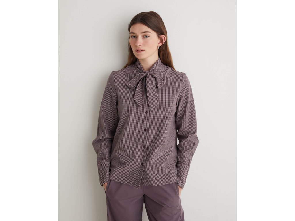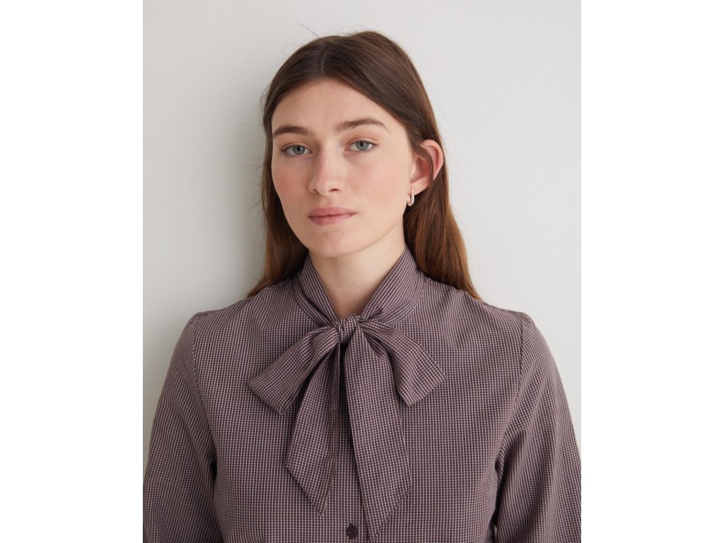 Tmavá blůza Yerse s mikro kostkovaným vzorem a mašlí u výstřihu vnese do Vašeho šatníku jemný nádech elegance.Je ušitá v regular fit střihu z 100 % bavlny — materiál je prodyšný, příjemný na dotek a ideální pro celodenní nošení. Kulatý výstřih zdobený mašlí a dlouhé rukávy s manžetami dodávají blůze ženský a zároveň profesionální vzhled.