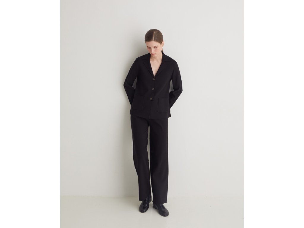 Moderní krátký blazer Yerse v černé barvě, vyrobený z jemného pleteného materiálu, který kombinuje pohodlí a styl. Má klopový límec, dlouhé rukávy a zapínání na knoflík vpředu. Spodní část zakončena jemnými rozparky po stranách. Dvě náprsní kapsy dotvářejí vzhled a zvyšují funkčnost. Ideální do kanceláře i na volnočasové vrstvení.
