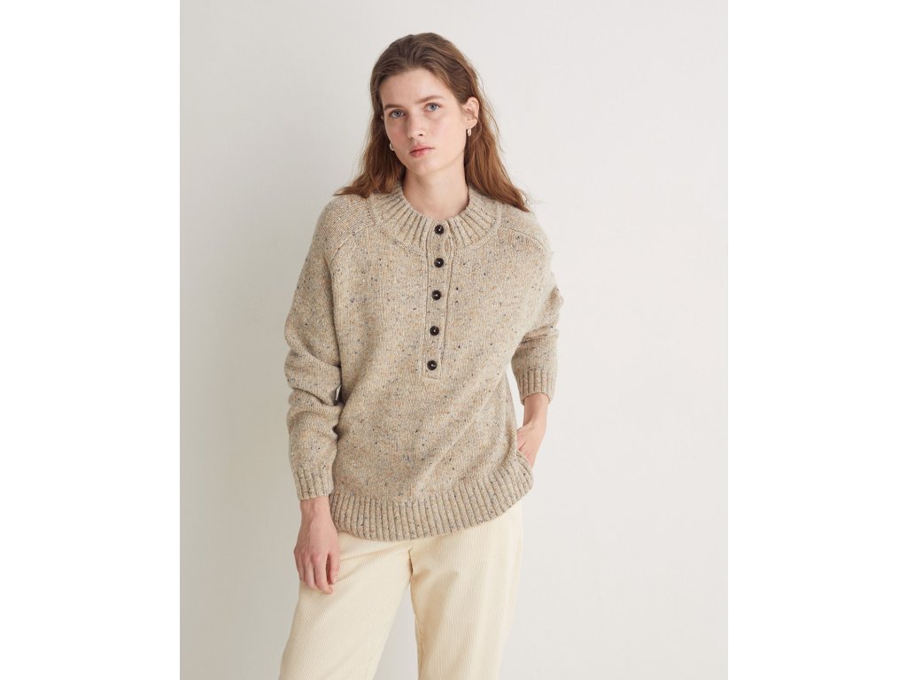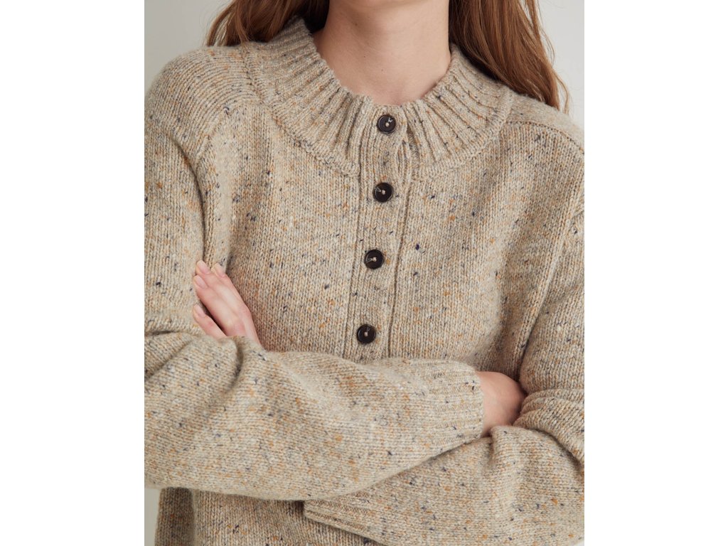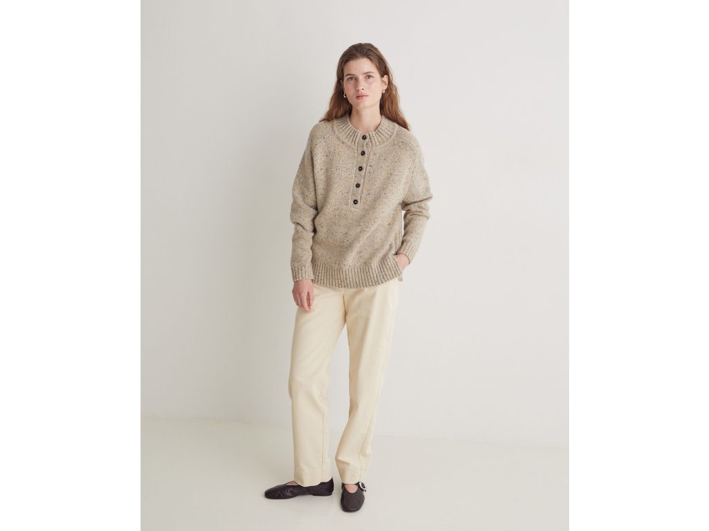 Jemný béžový svetr Yerse, který kombinuje komfort a styl. Design doplňují praktické knoflíky vpředu a límec typu Perkins. Raglánové rukávy zajišťují volnost pohybu a spodní rozparky po stranách přidávají lehkost střihu. Svetr má klasický rovný střih, který se výborně hodí k džínsům i elegantním kalhotám.