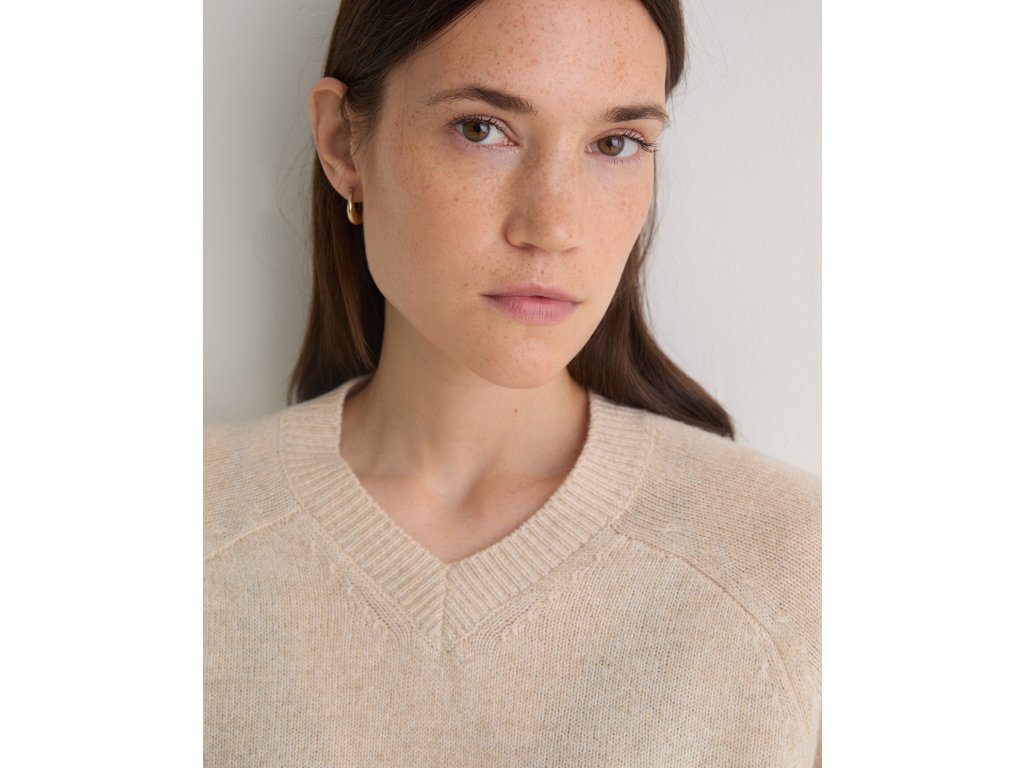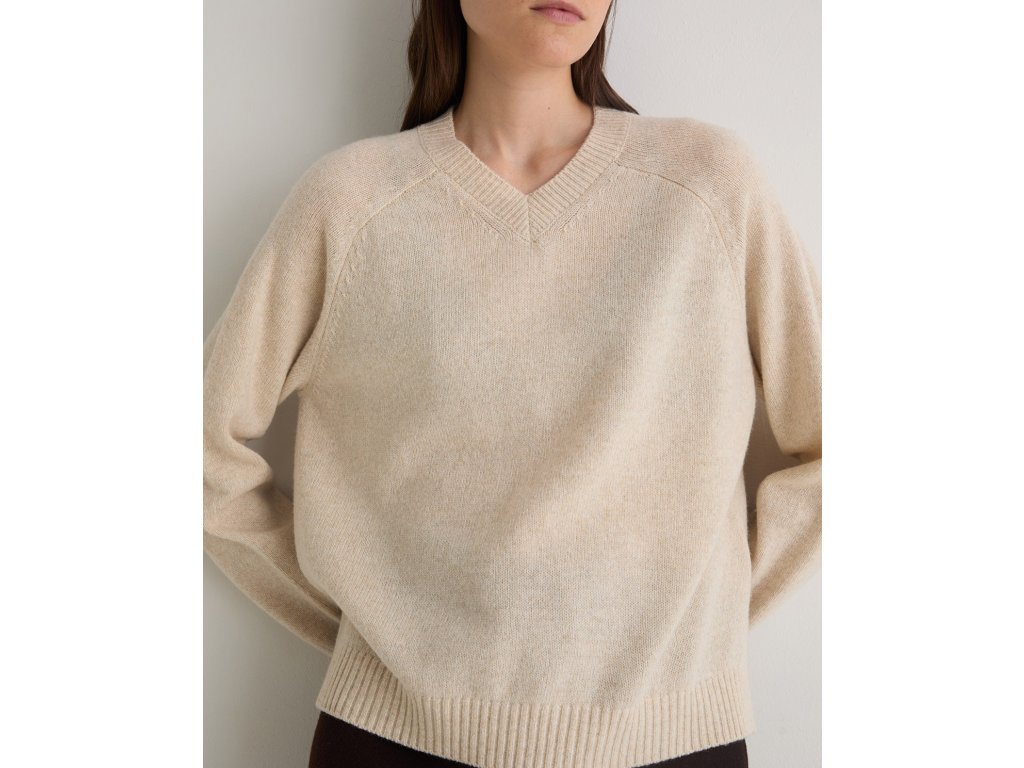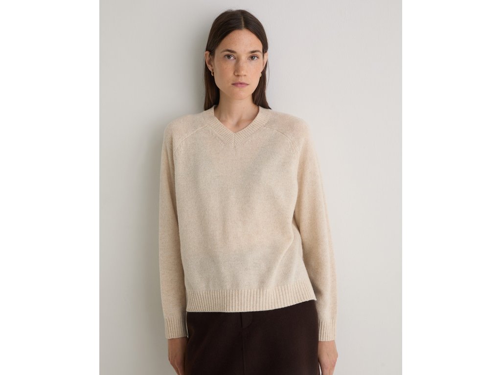 Měkký ecru svetr Yerse s výstřihem do V, který kombinuje pohodlí a elegantní vzhled. Dlouhé rukávy, žebrované lemy a rozparky na bocích u spodního lemu dodávají střihu lehkost a pohybovou volnost. Rovný střih je ideální pro vrstvení i samostatné nošení — hodí se k džínám i elegantním kalhotám.